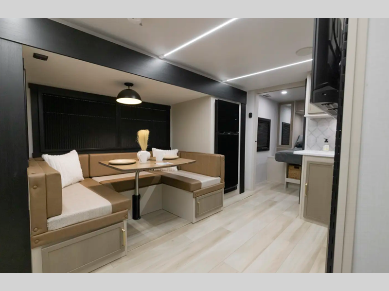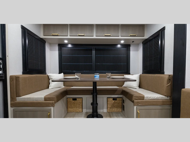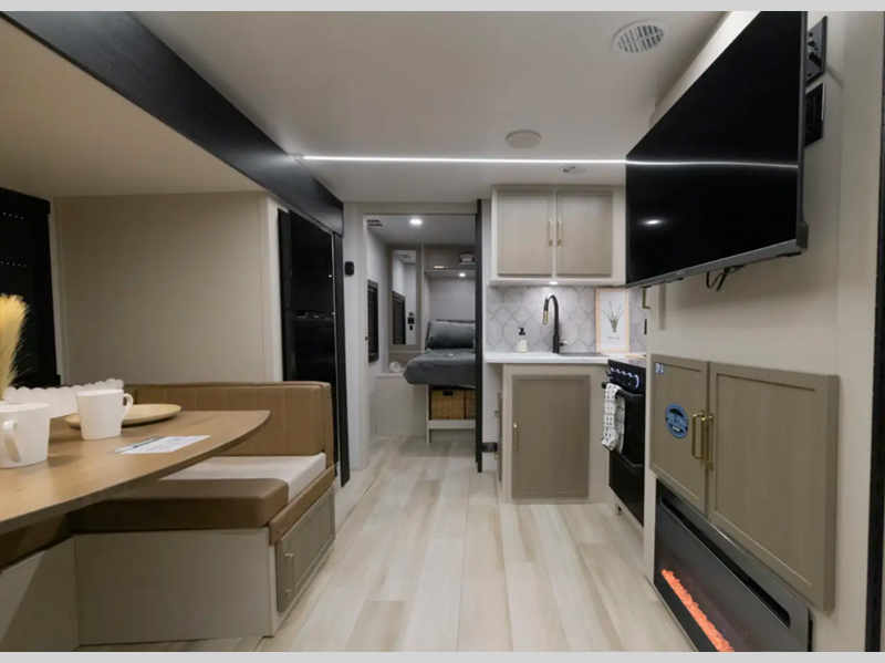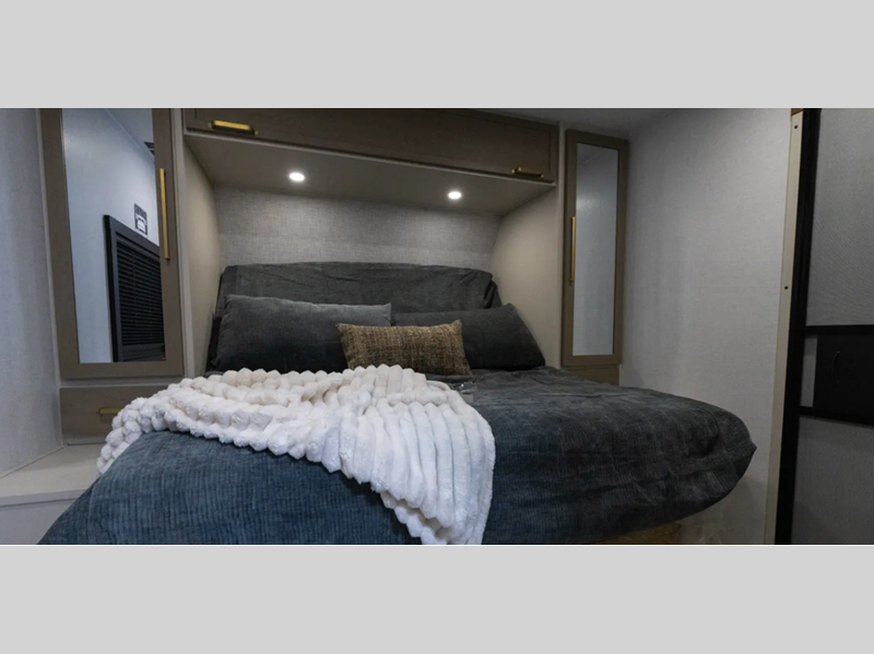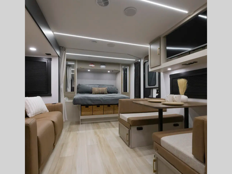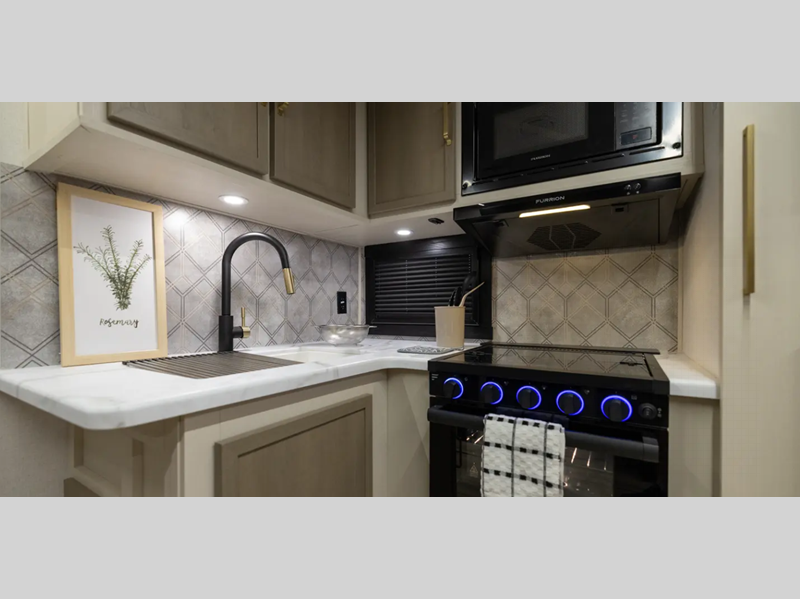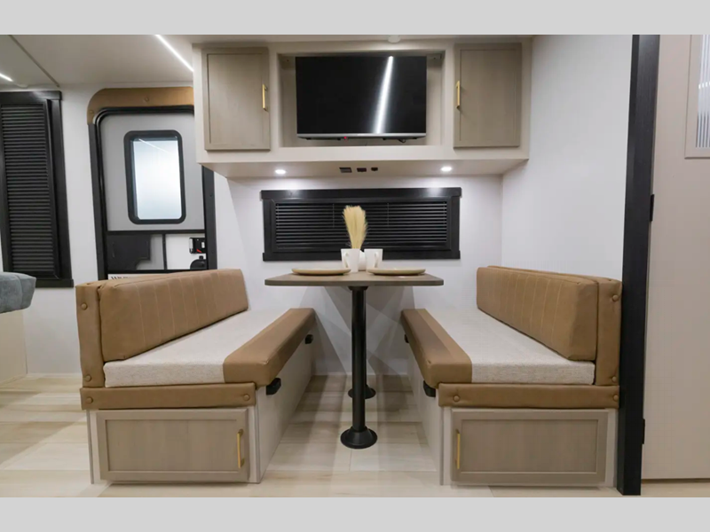 The Weather Shield one-piece fiberglass roof is ultra durable and the enclosed underbelly will help with better temperature control. There is also a shaded pet tether outside, along with a 2" accessory hitch receiver for more camp gear, and an awning with LED lights to name a few more conveniences. Head inside to enjoy Temple Cherry cabinetry with matte gold hardware, painted hardwood interior trim, and 60" x 80" bed for a comfortable stay!
