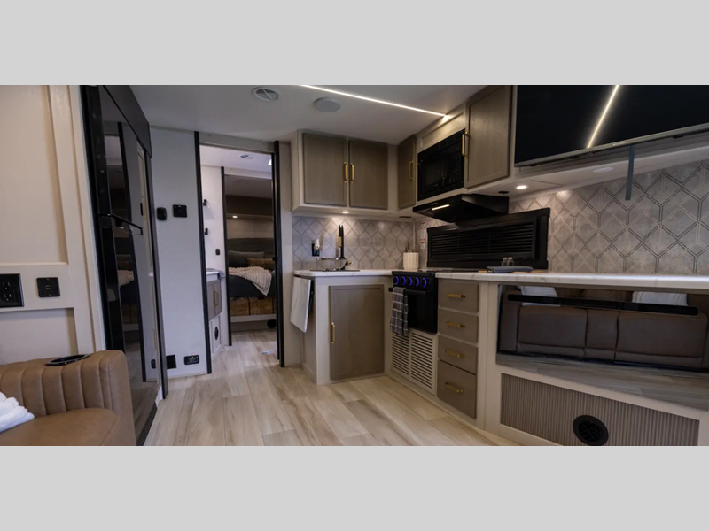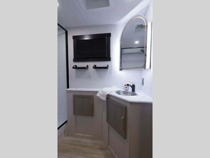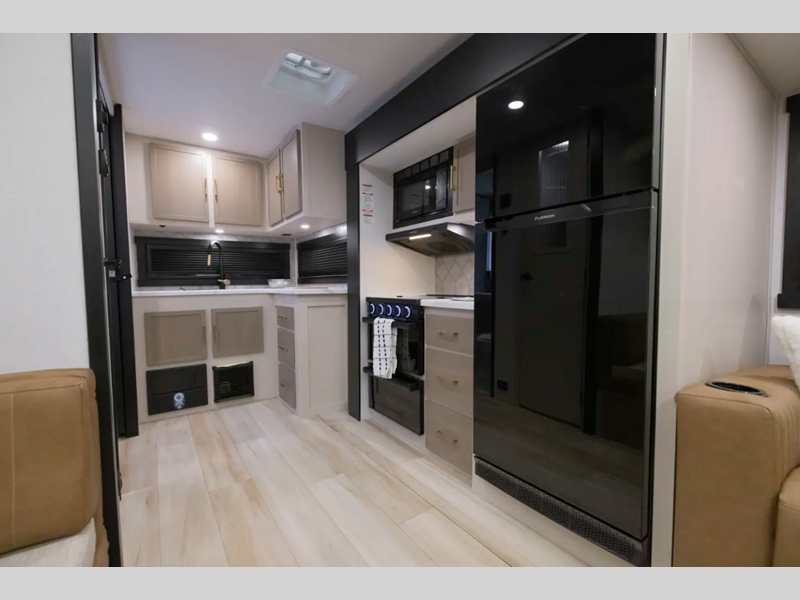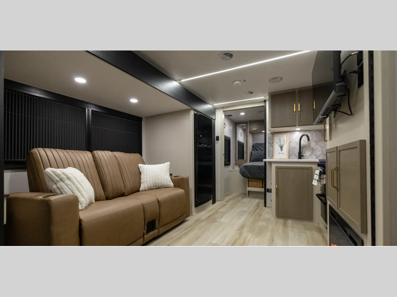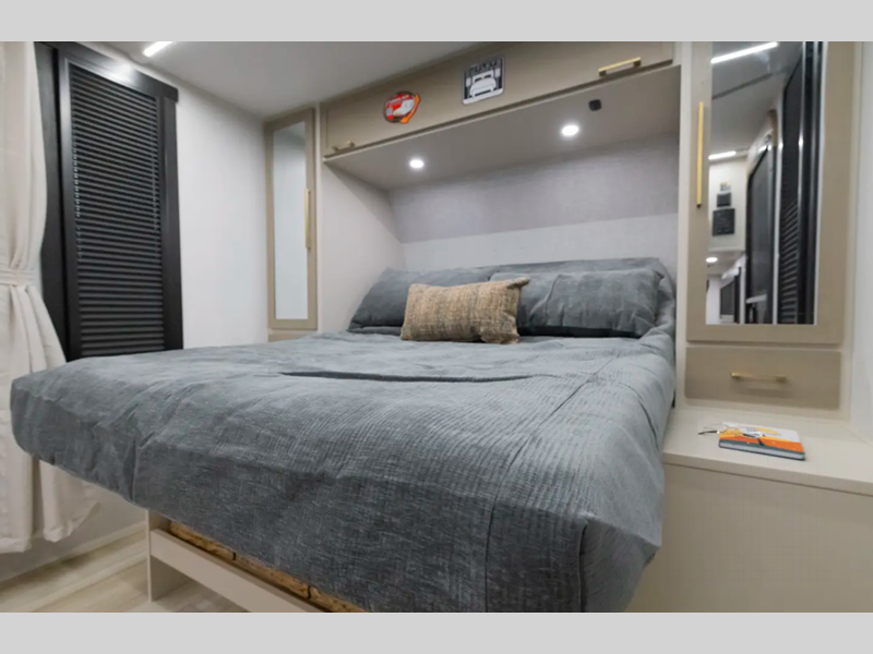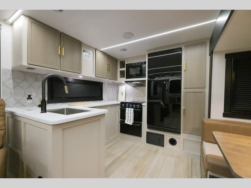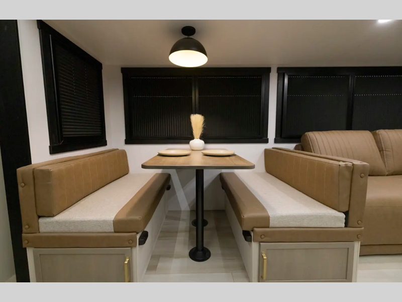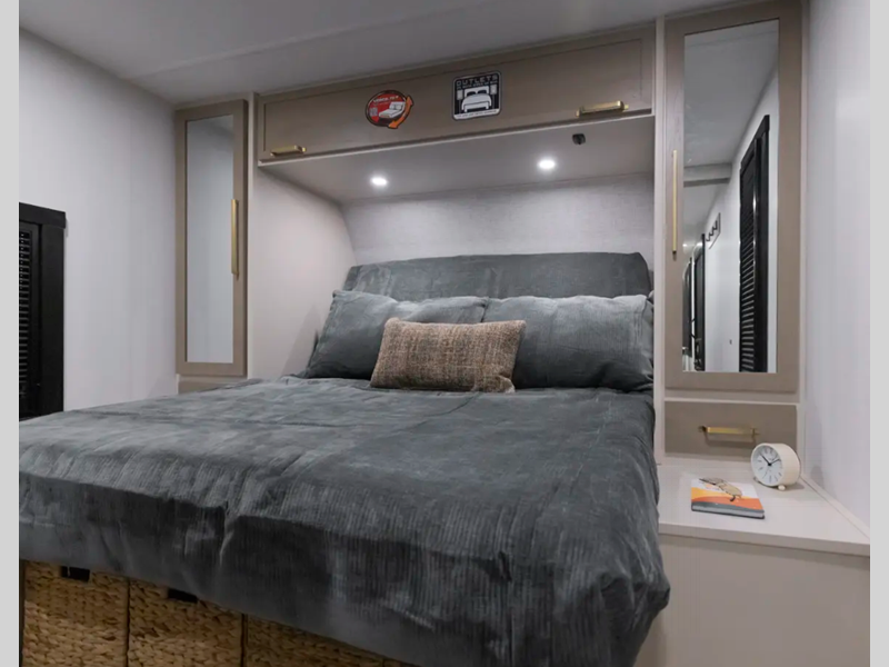 The Weather Shield one-piece fiberglass roof is ultra durable and the enclosed underbelly will help with better temperature control. There is also a shaded pet tether outside, along with a 2" accessory hitch receiver for more camp gear, and an awning with LED lights to name a few more conveniences. Head inside to enjoy Temple Cherry cabinetry with matte gold hardware, painted hardwood interior trim, and 60" x 80" bed for a comfortable stay!