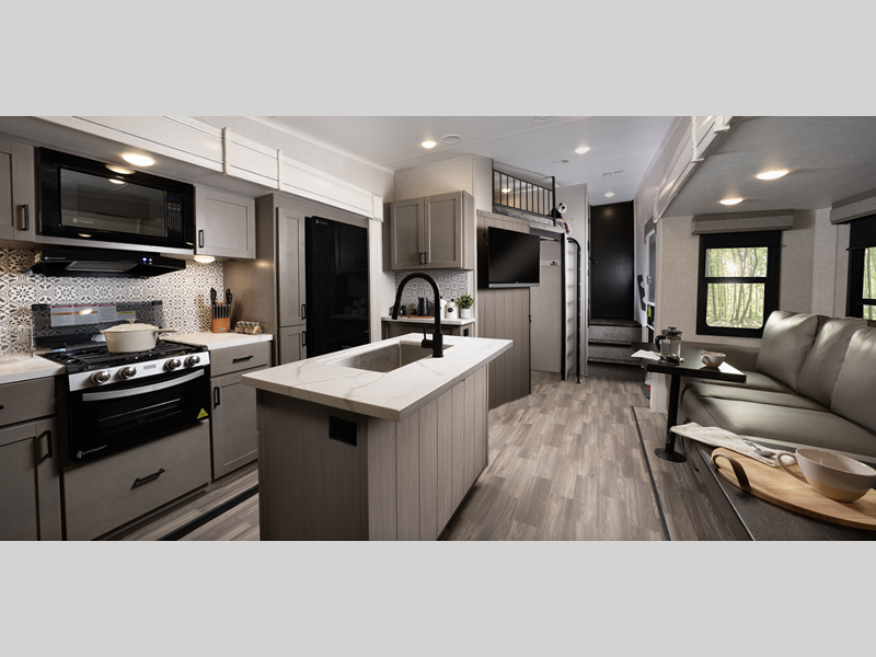 Sleeps 8 Slides 2 Length 33 ft 7 in Ext Width 8 ft 4 in Ext Height 13 ft 2 in Int Height 8 ft 5 in Interior Color Washed Driftwood Hitch Weight 1540 lbs GVWR 10600 lbs Dry Weight 8825 lbs Cargo Capacity 1775 lbs Fresh Water Capacity 55 gals Grey Water Capacity 60 gals Black Water Capacity 30 gals Tire Size ST235/80R16E Furnace BTU 30000 btu Number Of Bunks 1 Available Beds Queen Refrigerator Type 12 Volt Refrigerator Size 10 cu ft Cooktop Burners 3 Number of Awnings 2 LP Tank Capacity 20 lbs Water Heater Capacity 6 gal Water Heater Type Quick Recovery Gas/Electric AC BTU 15000 btu TV Info LR 40" Smart HDTV Awning Info 11' & 13' Power w/LED Lighting Axle Count 2 Number of LP Tanks 3 Shower Type Standard Electrical Service 50 amp Similar Floorplans