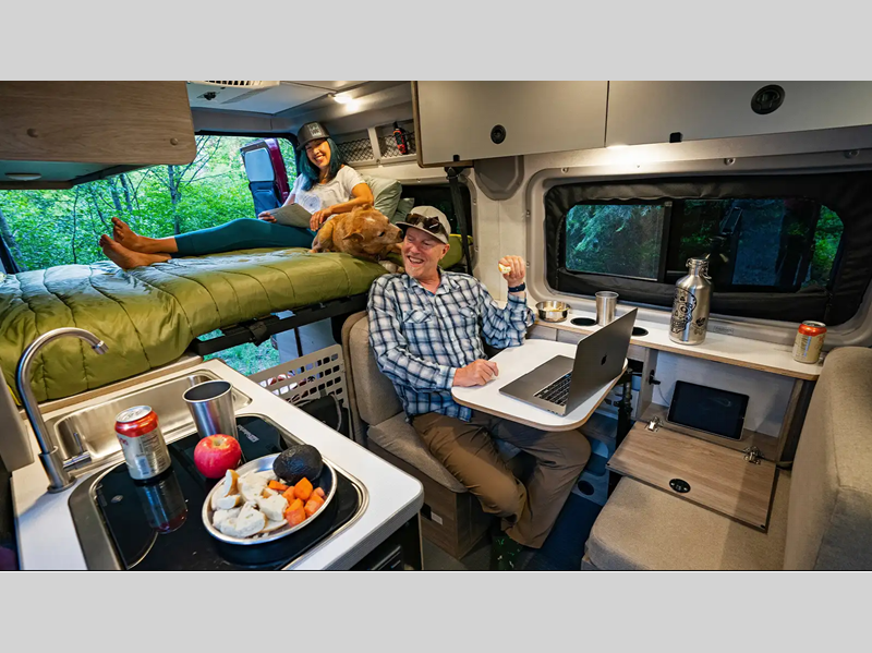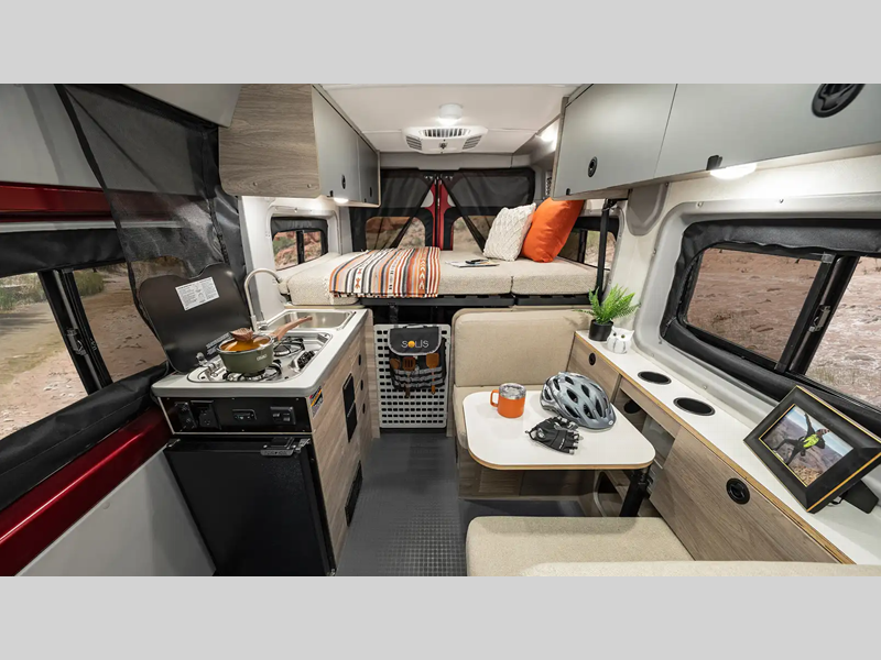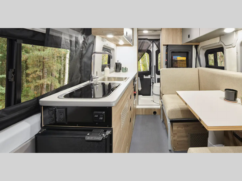 The flexible interiors come with plenty of storage, a fully equipped kitchen to keep your bellies full, and versatile sleeping arrangements. You can go all year around with the extended-season camping capabilities, like the Truma VarioHeat in model 36A and the Truma Combi Eco heating system in model 36B. Outside, you'll find a rear and side screen door to let fresh air in and keep bugs out, a fold-down exterior table, and more convenient features to van life easier than ever.