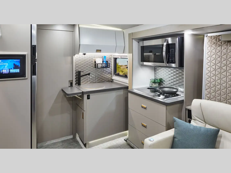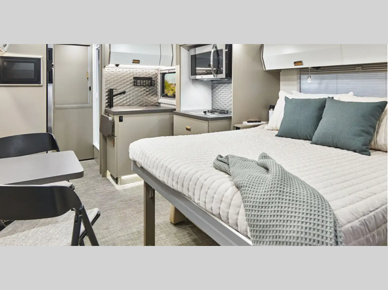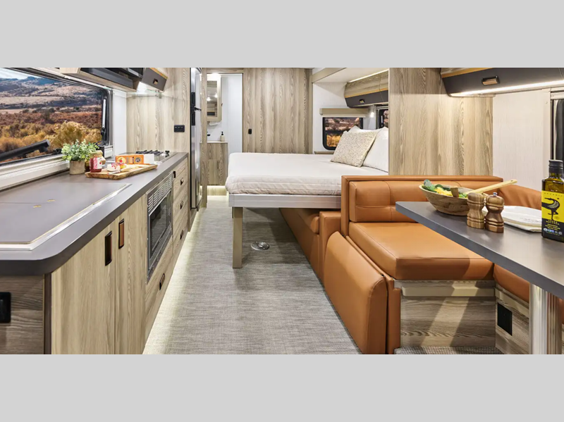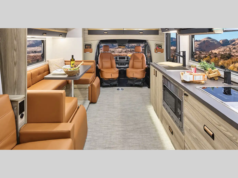 Sleeps 4 Slides 1 Length 25 ft 8 in Ext Width 7 ft 7 in Ext Height 10 ft 7 in Int Height 6 ft 8 in Interior Color Hygge Haus ll, Mod Allure ll Exterior Color Carbonite Gray, Misty Lake, Ocean Coast Hitch Weight 5000 lbs GVWR 11030 lbs Fresh Water Capacity 35 gals Grey Water Capacity 46 gals Black Water Capacity 47 gals Furnace BTU 25000 btu Fuel Type Diesel Engine 2.0L High Output Turbo Diesel 4-Cylinder Chassis Mercedes-Benz RWD Sprinter Fuel Capacity 24.5 gals Wheelbase 170 in Number Of Bunks 1 Available Beds Twin Beds with King Conversion Refrigerator Type 12V Two Door Compressor Driven Refrigerator Size 10 cu ft Convection Cooking Yes Cooktop Burners 2 Shower Size 25" x 30" Number of Awnings 1 Axle Weight Front 4410 lbs Axle Weight Rear 7720 lbs LP Tank Capacity 50.76 Water Heater Type Truma AquaGo Comfort Plus Tankless AC BTU 15000 btu Basement Storage 80.9 cu. ft. TV Info 32" LED HDTV, BR 24" LED HDTV Awning Info 16' Power with LED Lights & Bluetooth Control Gross Combined Weight 15250 lbs Shower Type Standard Electrical Service 30 amp Solar Wattage 240 watts Similar Floorplans